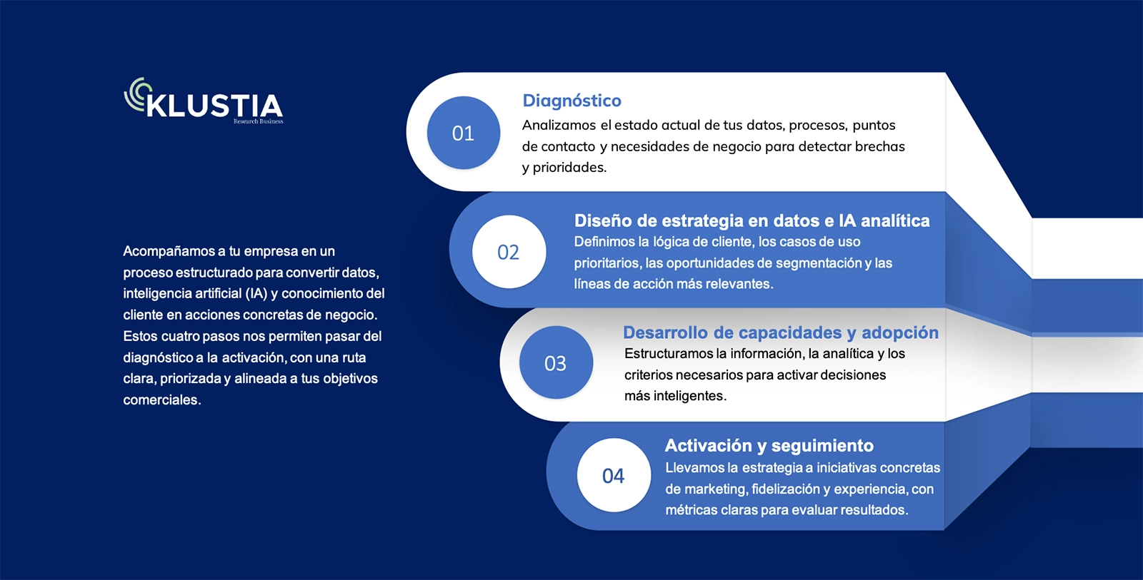 En Klustia ayudamos a las empresas a adoptar inteligencia artificial (IA) de forma práctica, estratégica y conectada con sus objetivos comerciales. Integramos datos, conocimiento del cliente y capacidades analíticas para transformar información dispersa en decisiones más inteligentes a lo largo de la relación con el cliente.